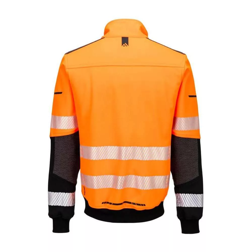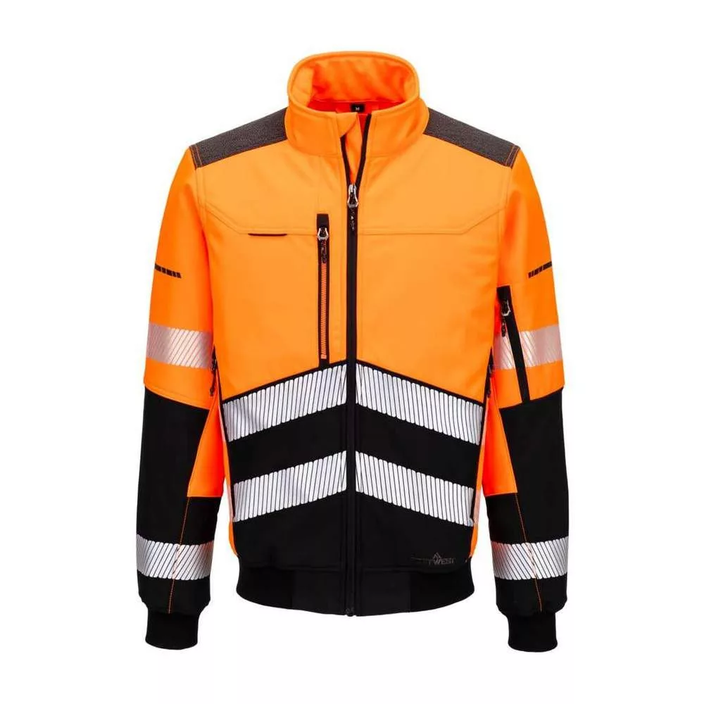 Az EV4 Hi-Vis Softshell Bomber dzseki lélegző, víz- és szélálló ripstop anyagból készült, vízállósággal és légáteresztő képességgel.