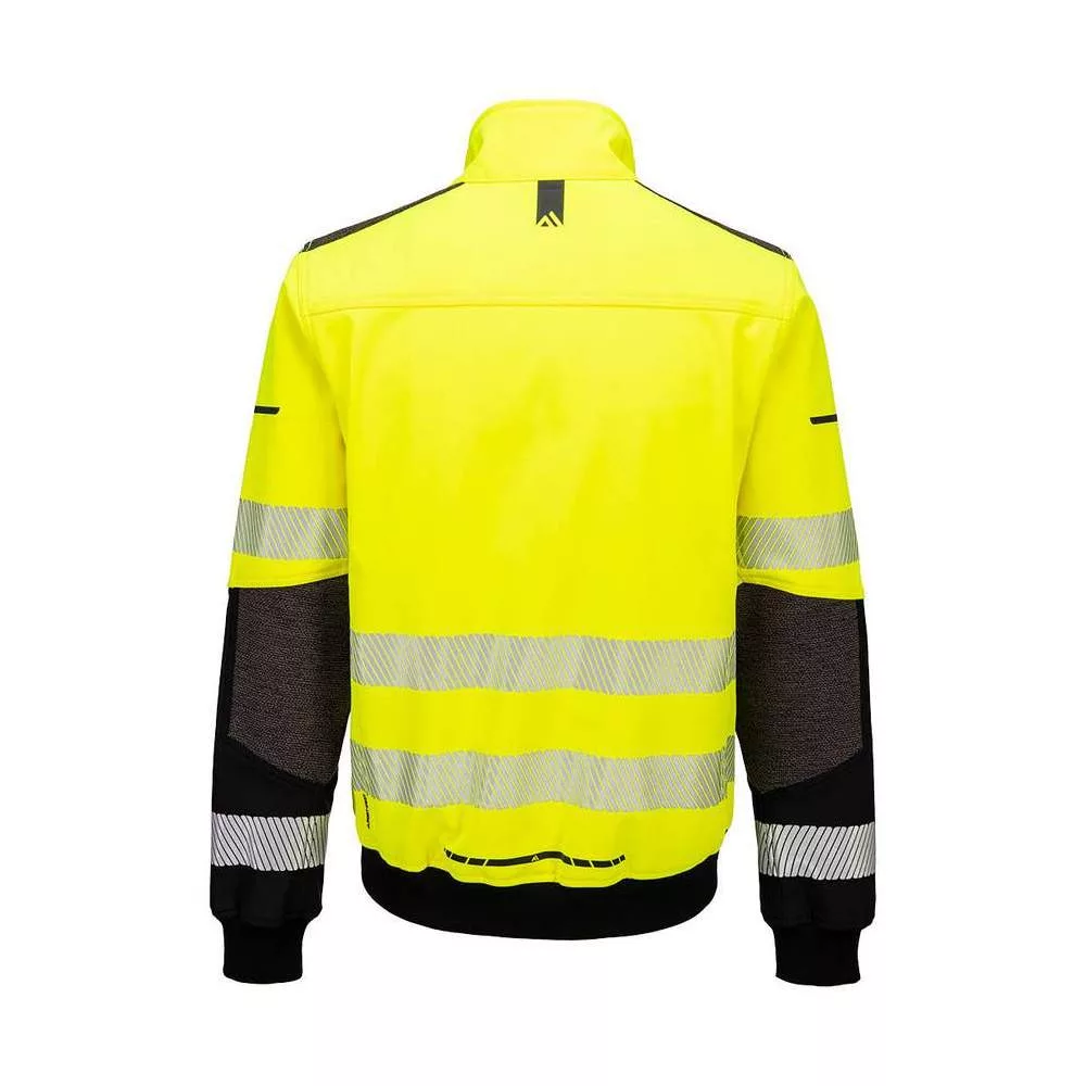 Az EV4 Hi-Vis Softshell Bomber dzseki lélegző, víz- és szélálló ripstop anyagból készült, vízállósággal és légáteresztő képességgel.